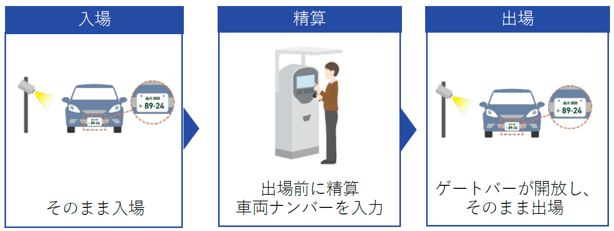 出場前に事前精算機でお客様の⾞両ナンバーを⼊⼒し、駐⾞料⾦を精算ください。