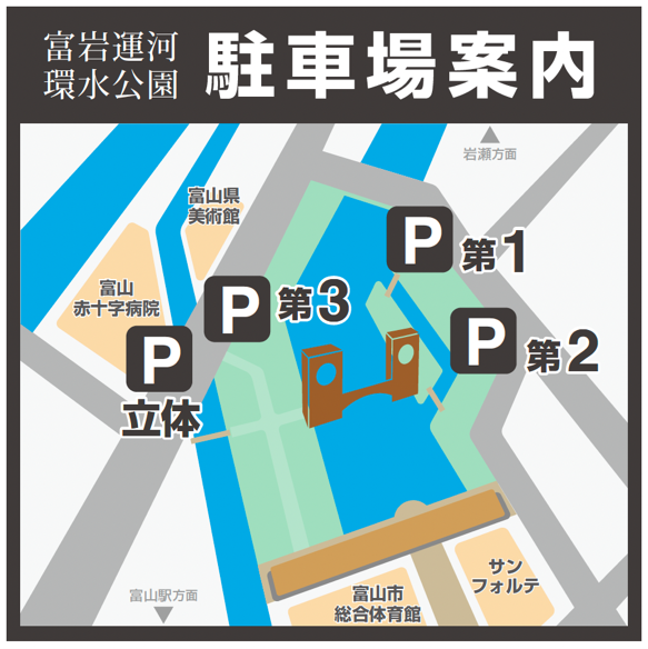 富岩運河環⽔公園の駐⾞場(北地区駐車場、スターバックス前駐車場、さくらの下駐車場、ラ・シャンス前駐車場)を有料化します。